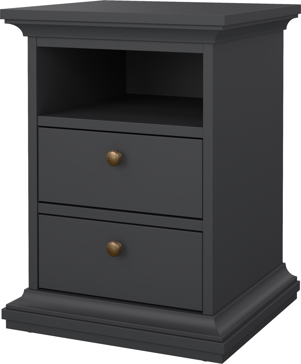 Nora natbord fra Vesterholm, leveret af Tvilum, er et elegant og praktisk valg til det private soveværelse. Dette matte grå sengebord med to skuffer og et åbent rum øverst kombinerer klassiske detaljer med moderne funktionalitet og er fremstillet i Danmar